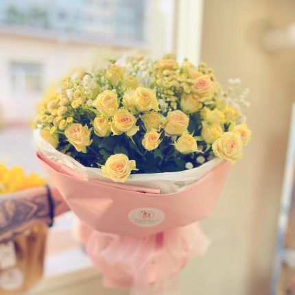 Букет из 17 разноцветных гербер и зелени в дизайнерской коробке “Салли”