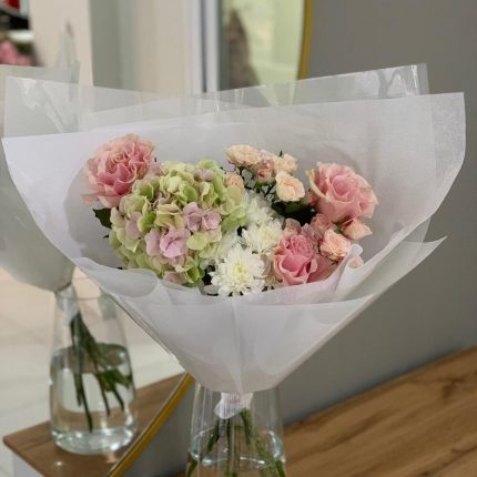 Нежный букет из гортензии, маттиолы, кустовой пион розы Бомбастик и розы Мента с эвкалиптом