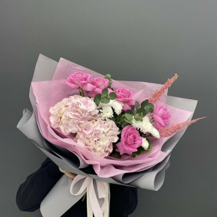 Композиция в керамическом кашпо с лагурусом,стабилизированной гортензией,мискантусом,кортадерией,пшеницей и фаларисом