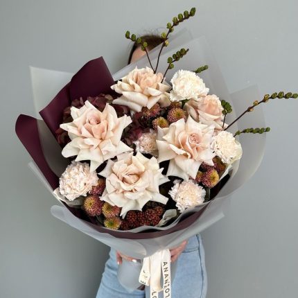 Корзина с розами, ирисами, кустовой хризантемой, альстромерией и лимониумом “Виноградная лоза”