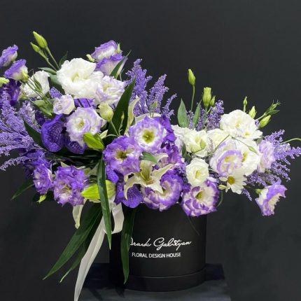 Шляпная коробка с гвоздикой, кустовой розой, гиперикумом, кустовой хризантемой “Фруктовые леденцы”