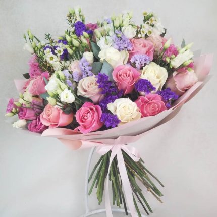 Цветы в большой коробке: садовые розы, лизиантус, маттиола, тюльпаны