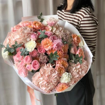 Цветы в коробке с пион розами,сиренью,ранункулюсами,эустомой,тюльпанами,матиолой,пионовидными кустовыми розами