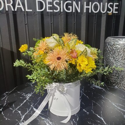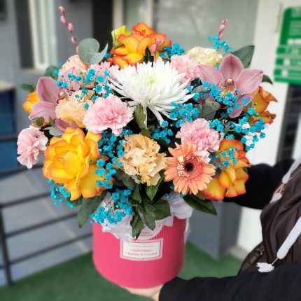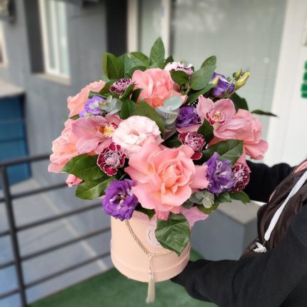 Корзина с розовыми, желтыми и зелеными орхидеями “Тропический сад орхидей”