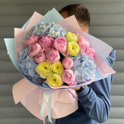 С чистого листа – Композиция с лилиями, пионовидными розами и пионами
