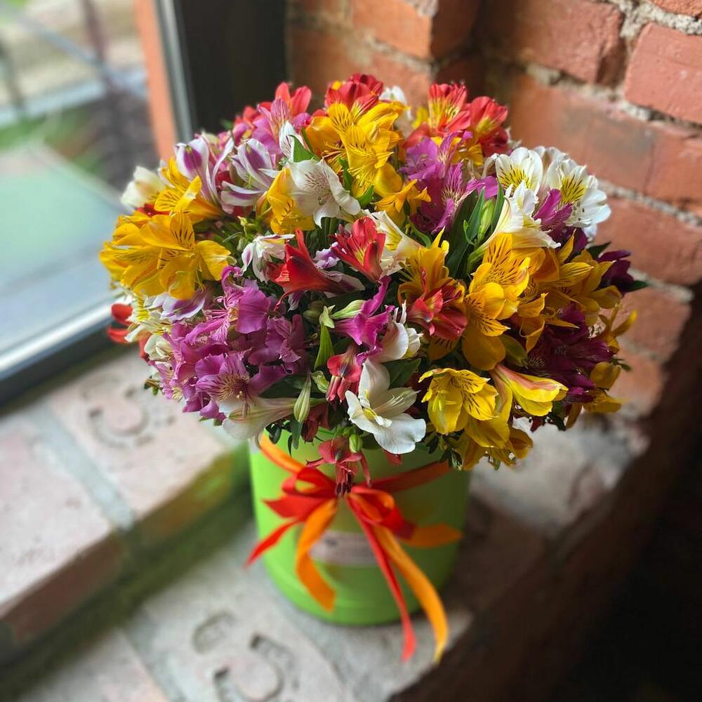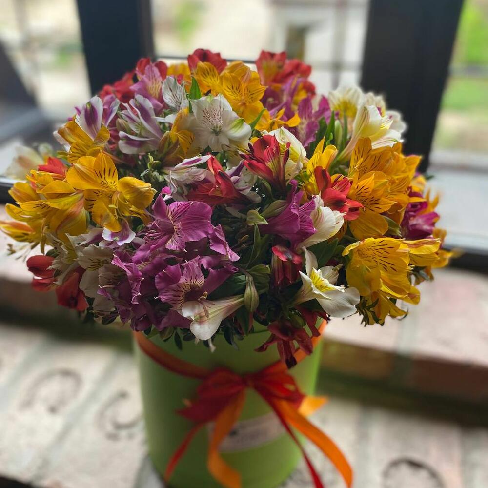 Букет из 35 разноцветных альстромерий в шляпной коробке “Ирэн Адлер”
