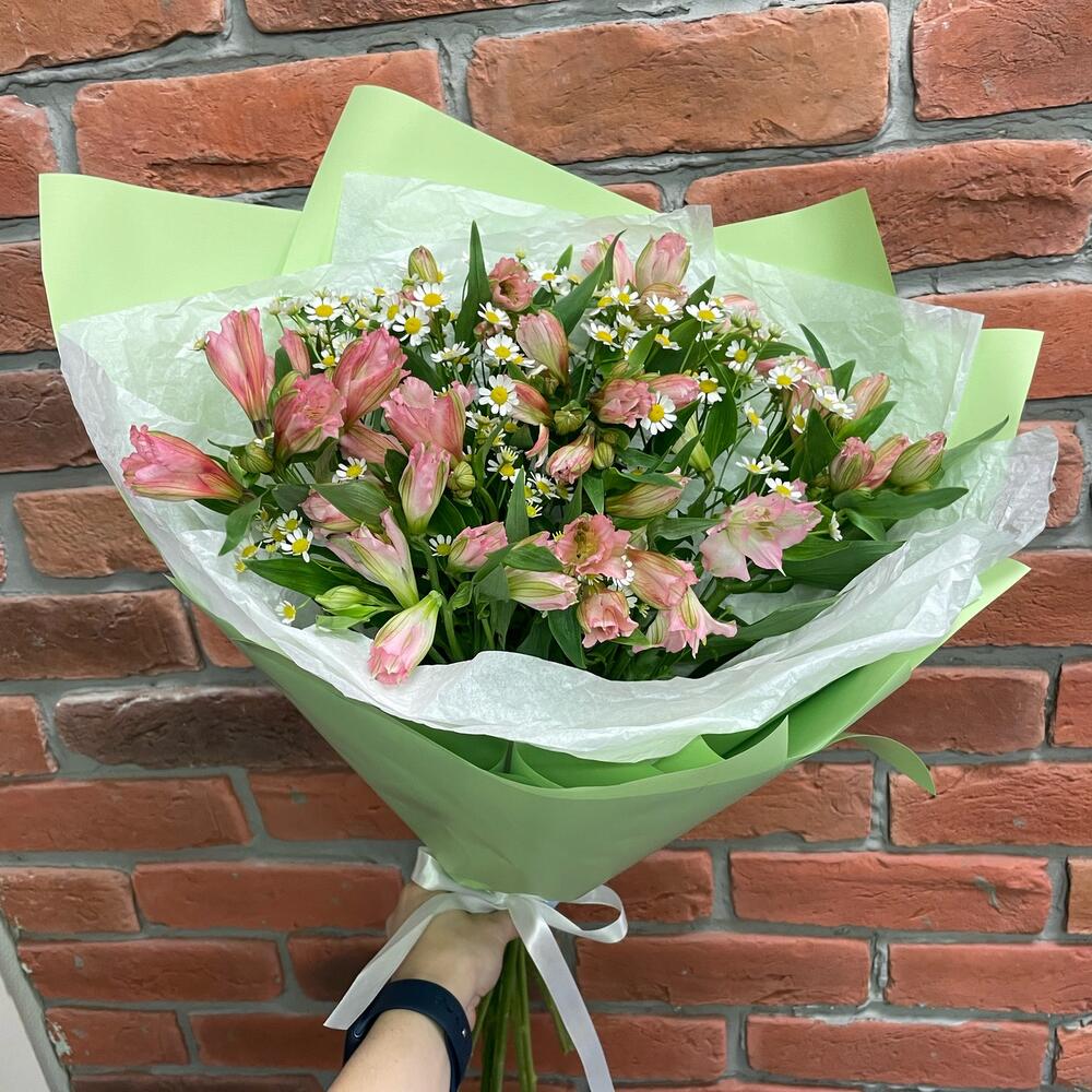 Альстромерия – 9 шт.Матрикария – 6 шт.Упаковка дизайнерская – 1 шт.Лента атласная – 1 шт.