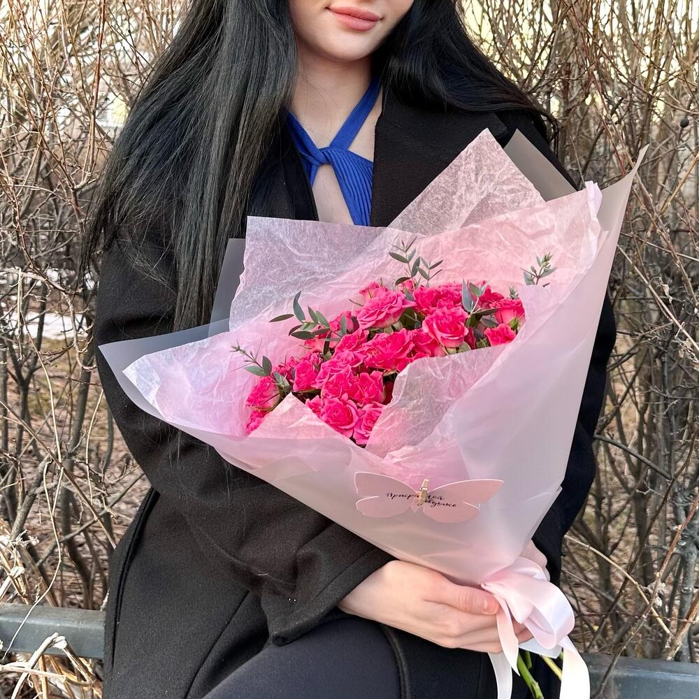 Эвкалипт – 3 шт.Лента атласная – 1 шт.Пленка матовая – 2 шт.Открыточка с вашими пожеланиями – 1 шт.Тишью розовая – 2 шт.