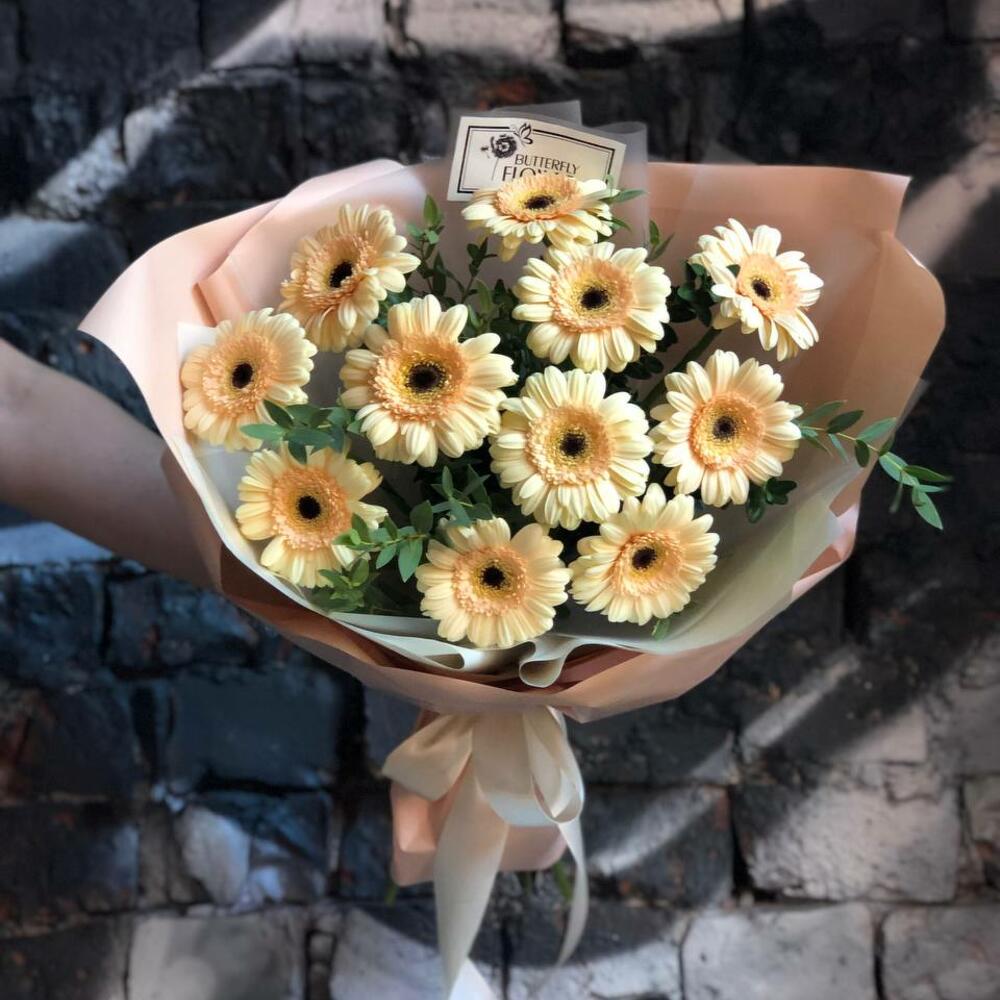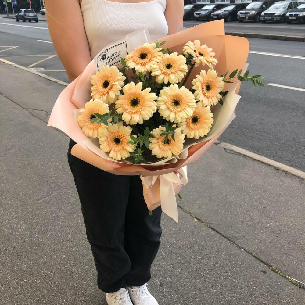 Букет из 11 персиковых мини-гербер и зелени в дизайнерской упаковке “Персиковые бабочки”