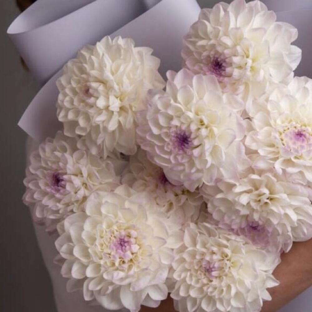 Георгина белая – 9 шт.Упаковка дизайнерская – 1 шт.Лента атласная – 2 шт.Открыточка с вашими пожеланиями – 1 шт.хорошее настроение – 100 шт.инструкция по уходу за цветами – 1 шт.коробка переноска – 1 шт.Кризал – 1 шт.