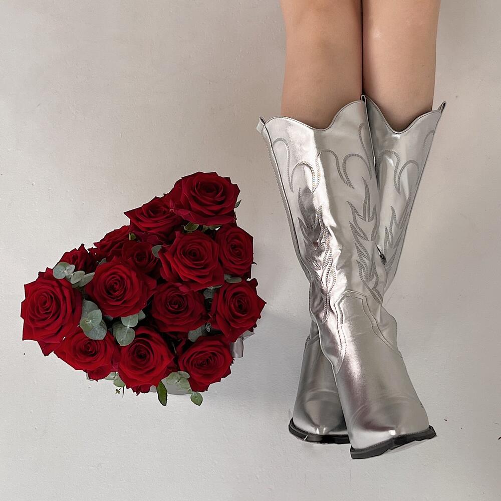 розы красные – 15 шт.Эвкалипт – 7 шт.Коробка шляпная – 1 шт.