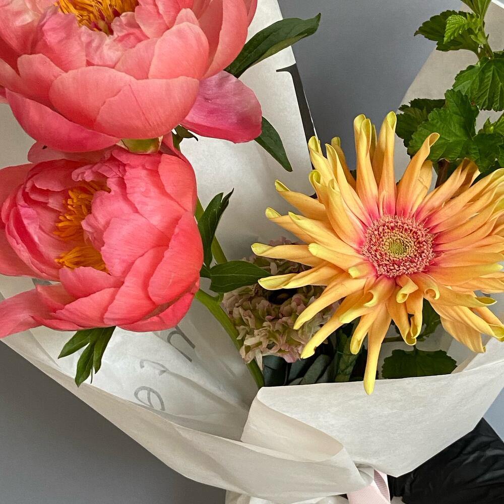 Пион – 2 шт.Гербера – 1 шт.Ранункулюс – 1 шт.ветка декоративная – 1 шт.Упаковка дизайнерская – 1 шт.инструкция по уходу за цветами – 1 шт.