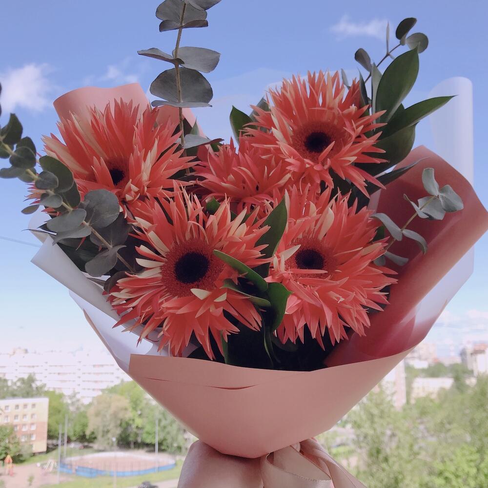Очаровательный букет из изысканных свежих цветов.В составе: махровые гебреры, эвкалипт, рускусБукет цветов — обязательный презент для прекрасной половины человечества. Это красивый способ сделать женщину счастливой.Чтобы букет радовал дольше необходимо:❤ Ставить его в прохладном месте, избегая отопительных приборов и прямых солнечных лучей. ❤ Наполнить вазу большим количеством воды. ❤ Как можно чаще освежать срез и воду. Почему выбирают нас? – Работаем на качество. – В подарок к каждому букету витамины для цветов. – Бережно упакуем в транспортировочную пленку, чтобы защитить во время доставки от любых погодных условий. – Приложим инструкцию, как правильно ухаживать за цветами.Сохраняйте товар в подборках, чтобы не потерять