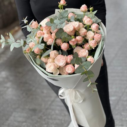 15 нежно-розовых французских роз с эвкалиптом