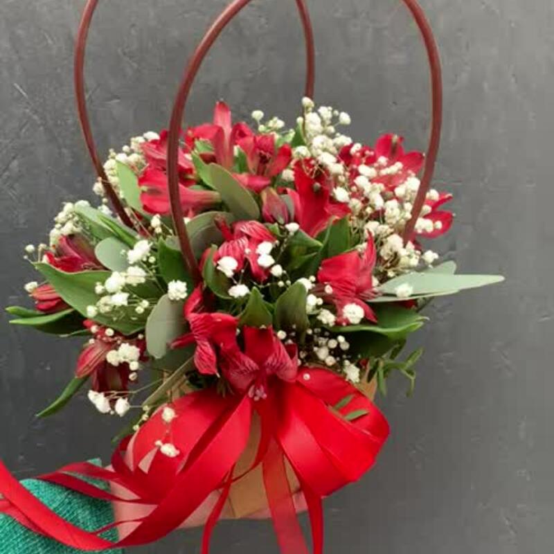Альстромерия – 5 шт.Гипсофила – 2 шт.Фисташка – 5 шт.Эвкалипт – 5 шт.Сумочка картонная – 1 шт.Оазис флористический – 1 шт.Лента атласная – 3 шт.