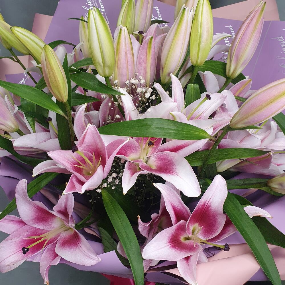 Лилия розовая – 9 шт.Гипсофила – 3 шт.Упаковка дизайнерская – 3 шт.