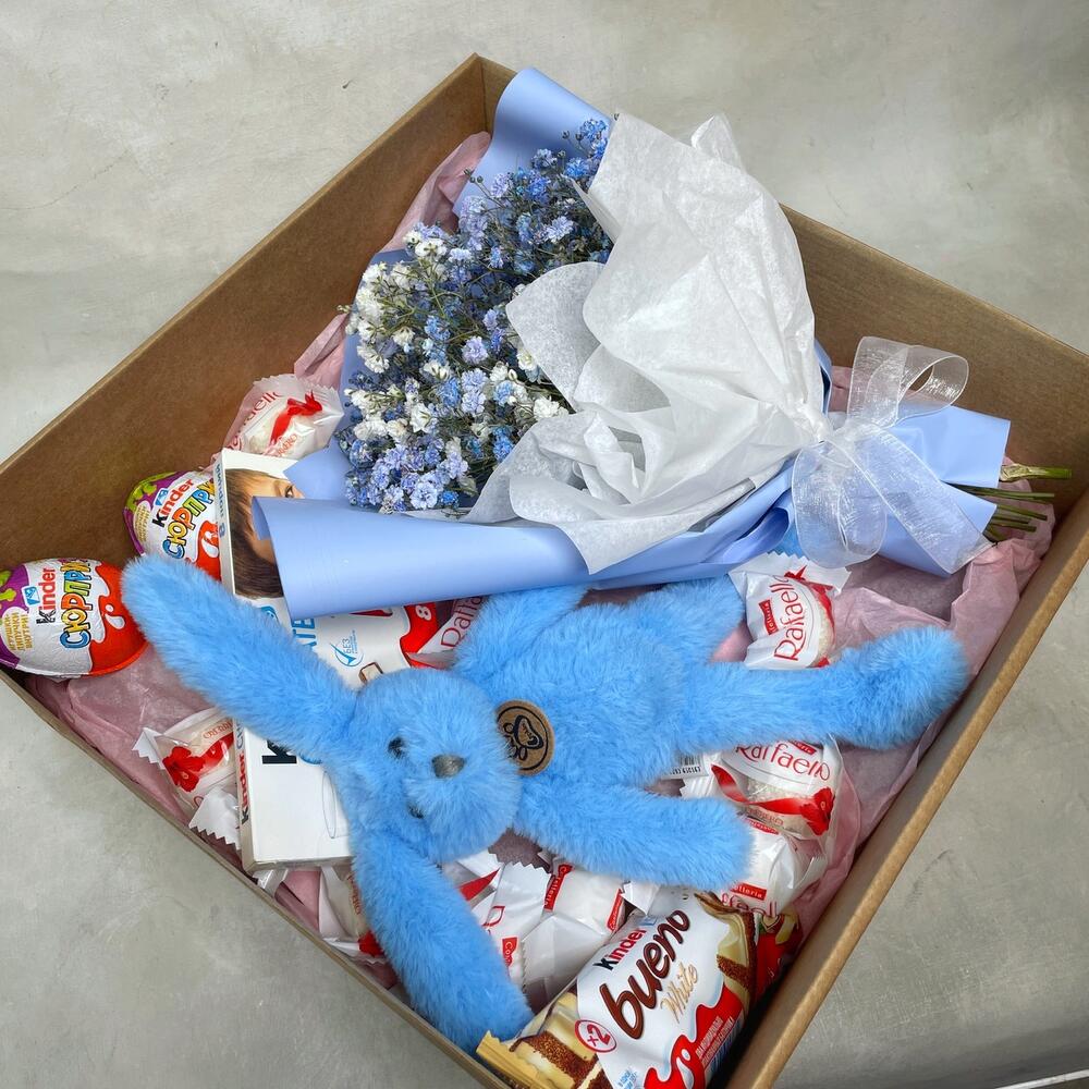 Гипсофила – 3 шт.Упаковка – 1 шт.Kinder bueno – 1 шт.Kinder сюрприз – 2 шт.Kinder chocolate – 1 шт.Raffaello конфеты – 10 шт.коробка крафт с окошком – 1 шт.игрушка зайчонок lapkin – 1 шт.