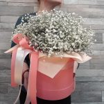 “Сиреневый туман” – композиция из гипсофилы в шляпной коробке