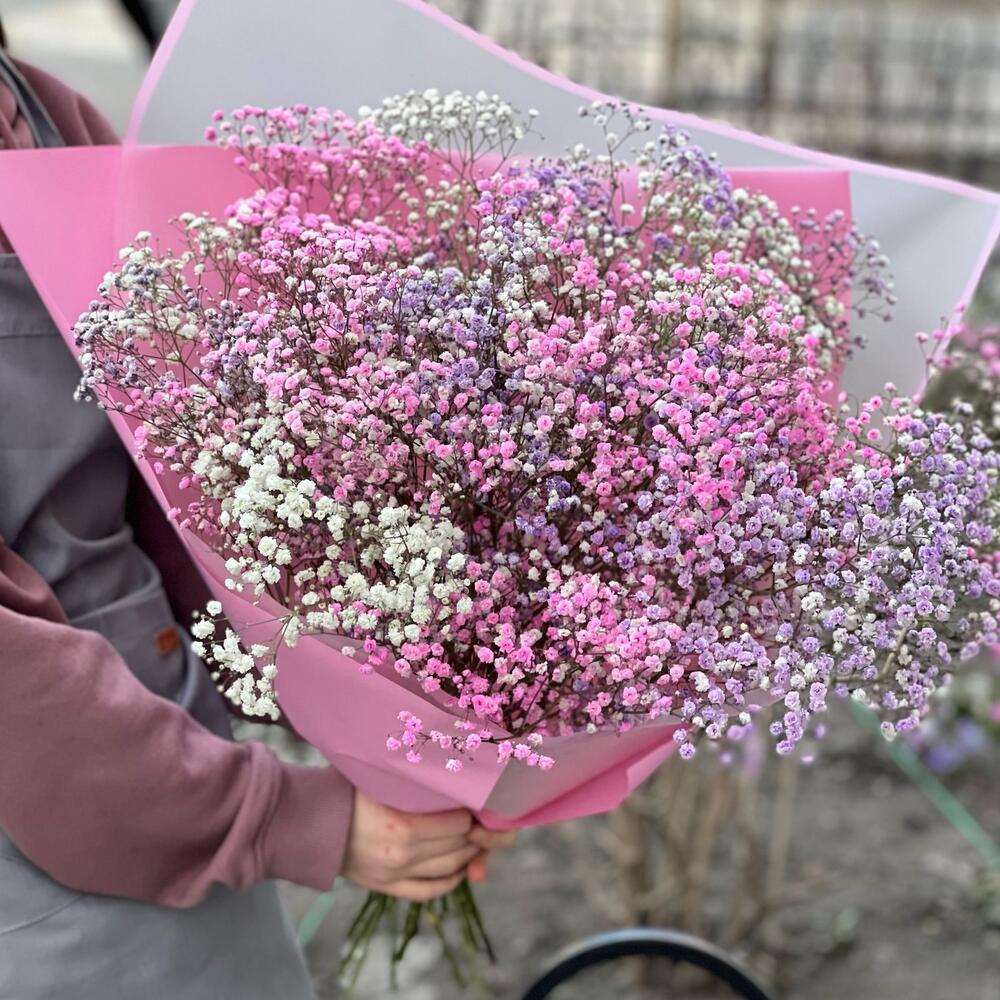 гипсофила радужная разноцветная – 15 шт.Упаковка дизайнерская – 1 шт.Лента атласная – 1 шт.