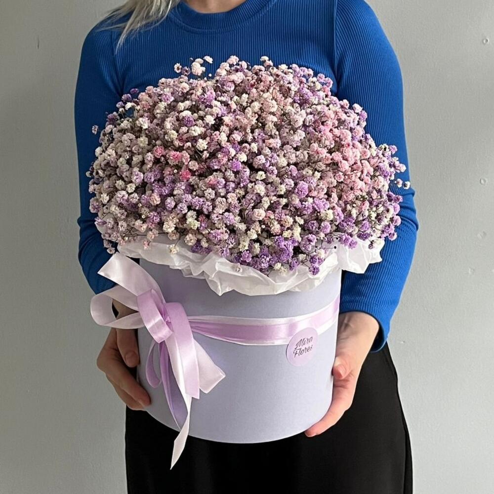 Гипсофила – 15 шт.Коробка шляпная – 1 шт.Оазис – 1 шт.Лента атласная – 2 шт.Тишью белое – 1 шт.