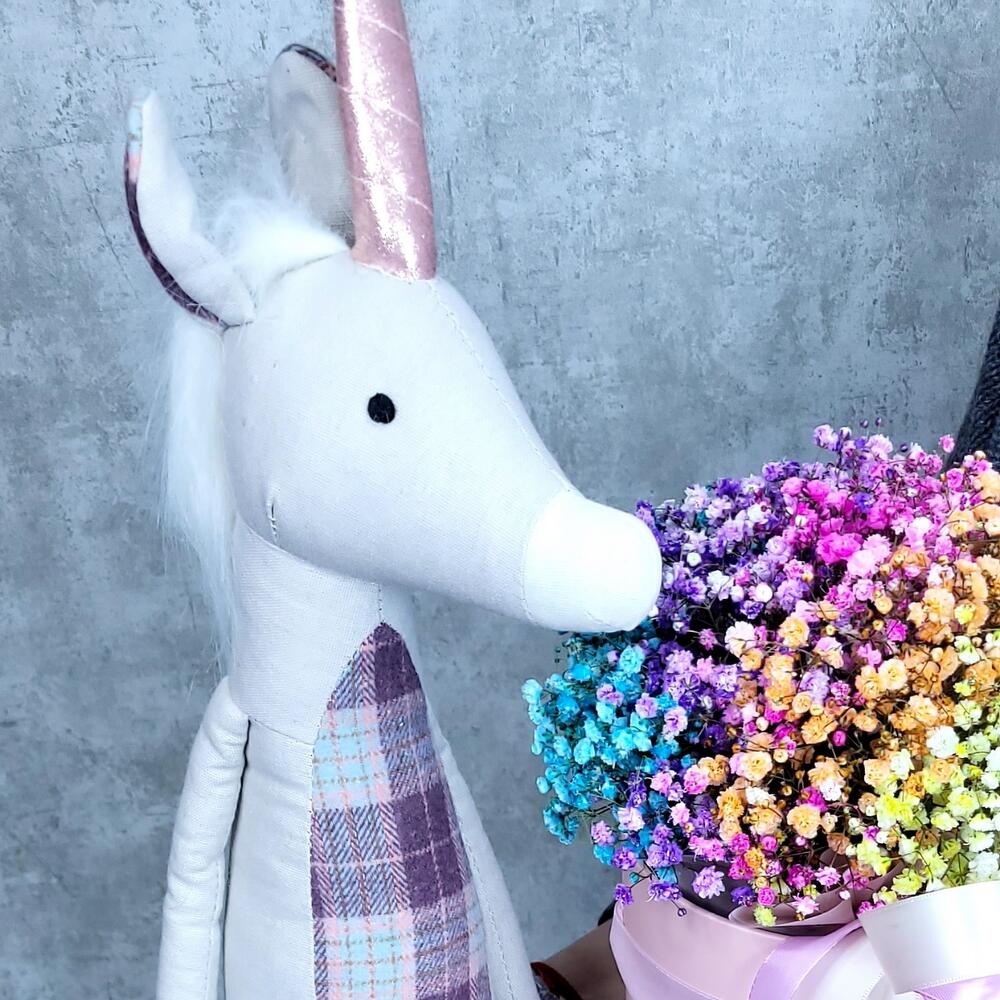 Единорог Евграф и коробочка с радужной гипсофилой