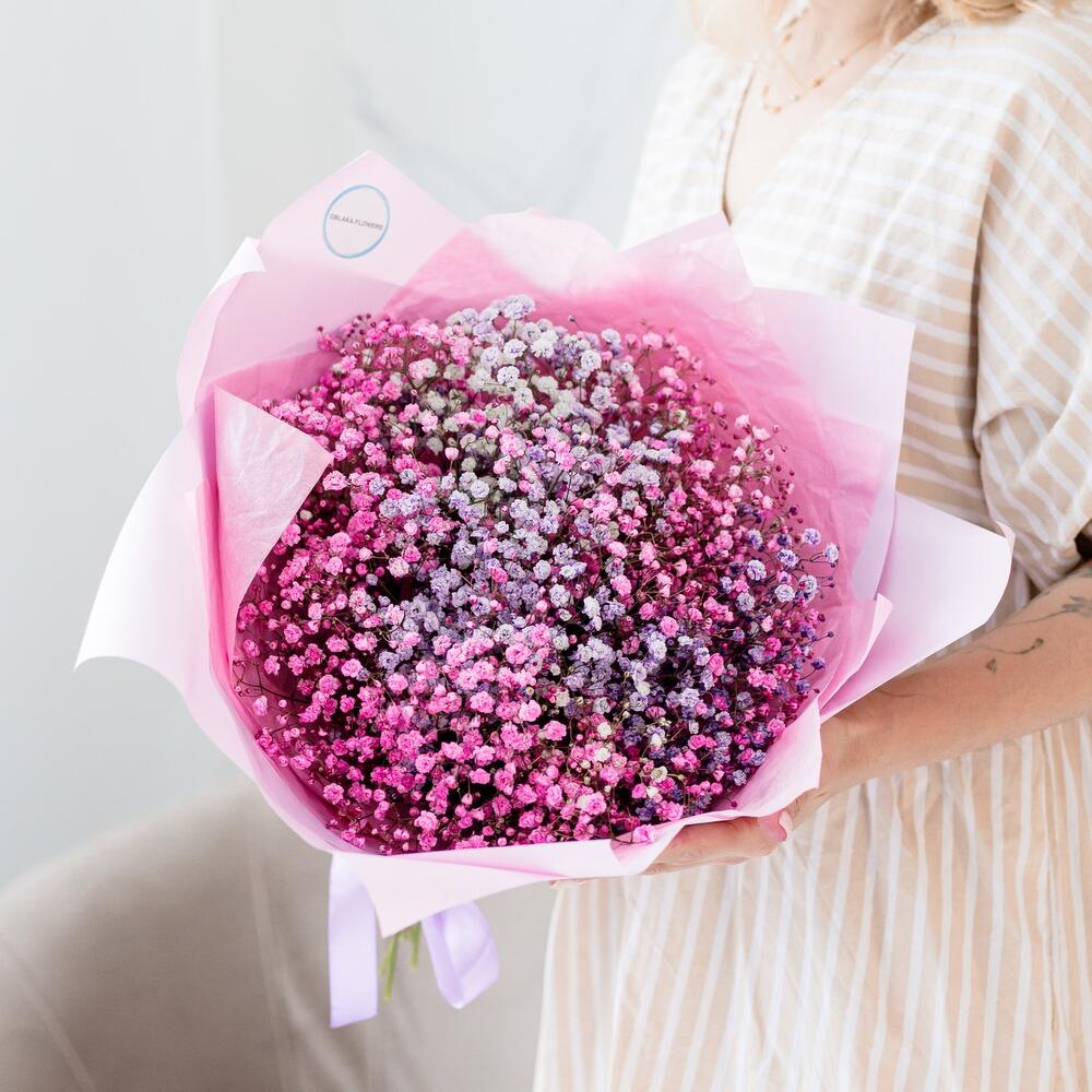 гипсофила цветная – 11 шт.Упаковка корейская пленка – 2 шт.Тишью – 2 шт.Лента атласная – 1 шт.Упаковка транспортировочная пленка – 1 шт.инструкция по уходу за цветами – 1 шт.