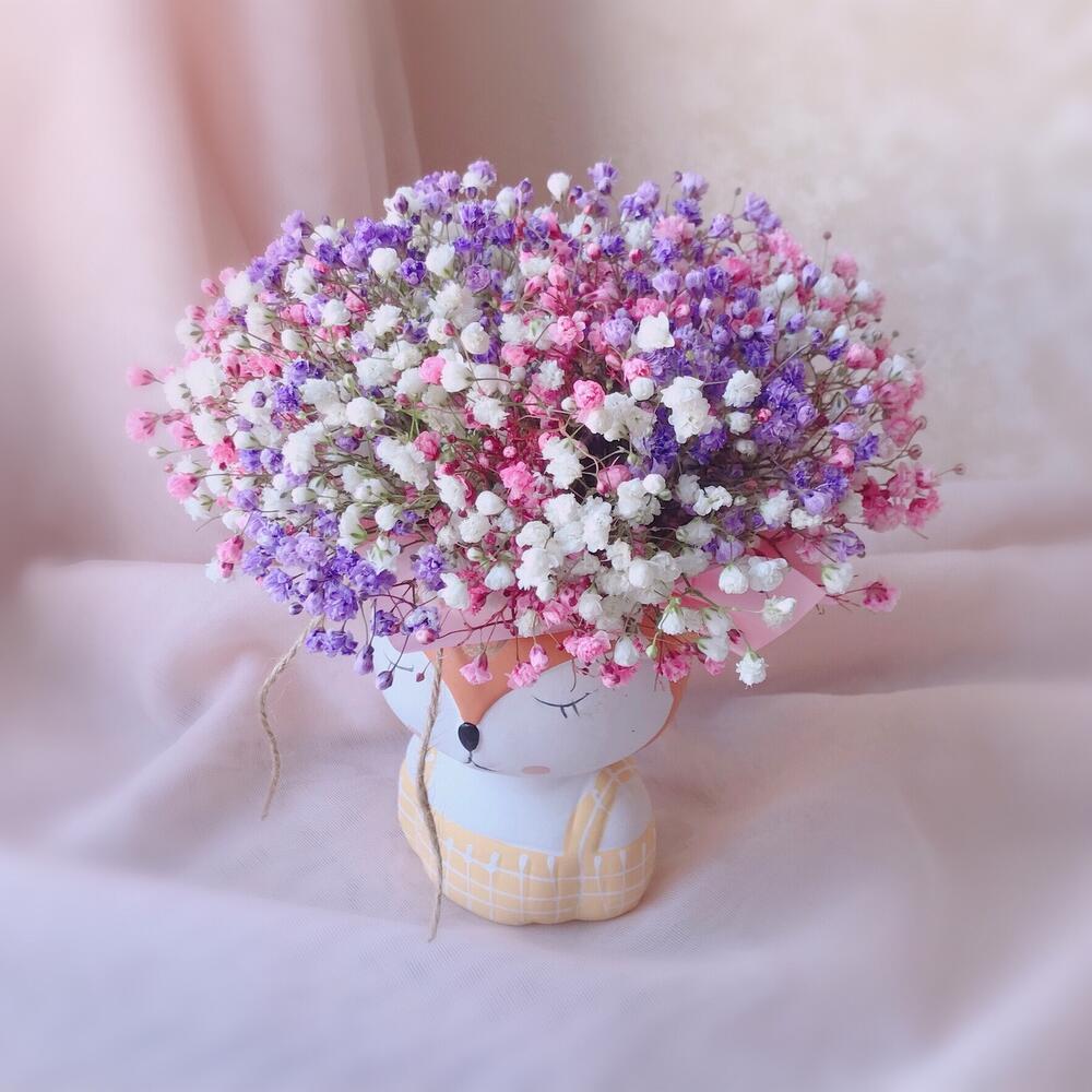 Радужная гипсофила в кашпо из керамики «Лисичка»