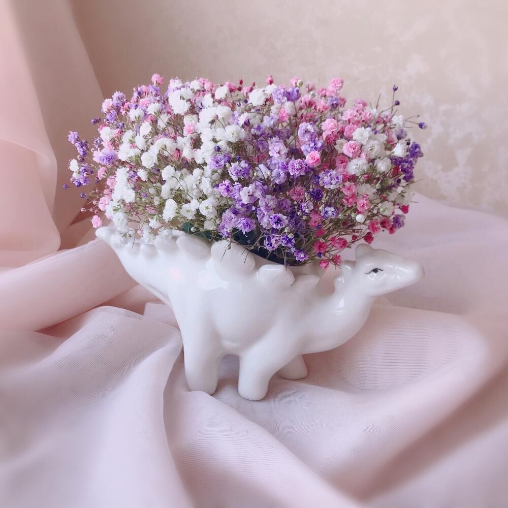 Радужная гипсофила в керамическом кашпо «Стегозавр»