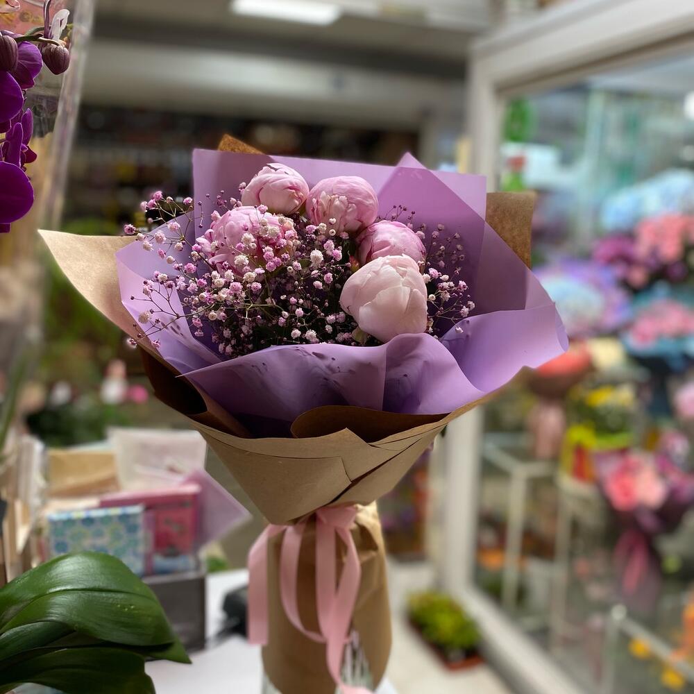 Гипсофила – 3 шт.Упаковка дизайнерская – 2 шт.пионы – 5 шт.