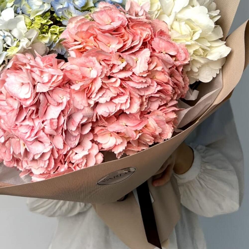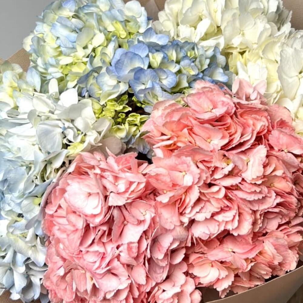 Авторская композиция из гортензий, роз и ранункулюсов в шляпной коробке