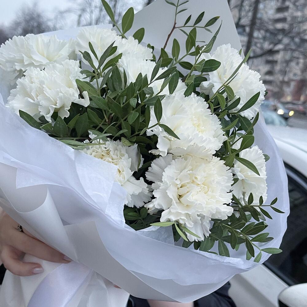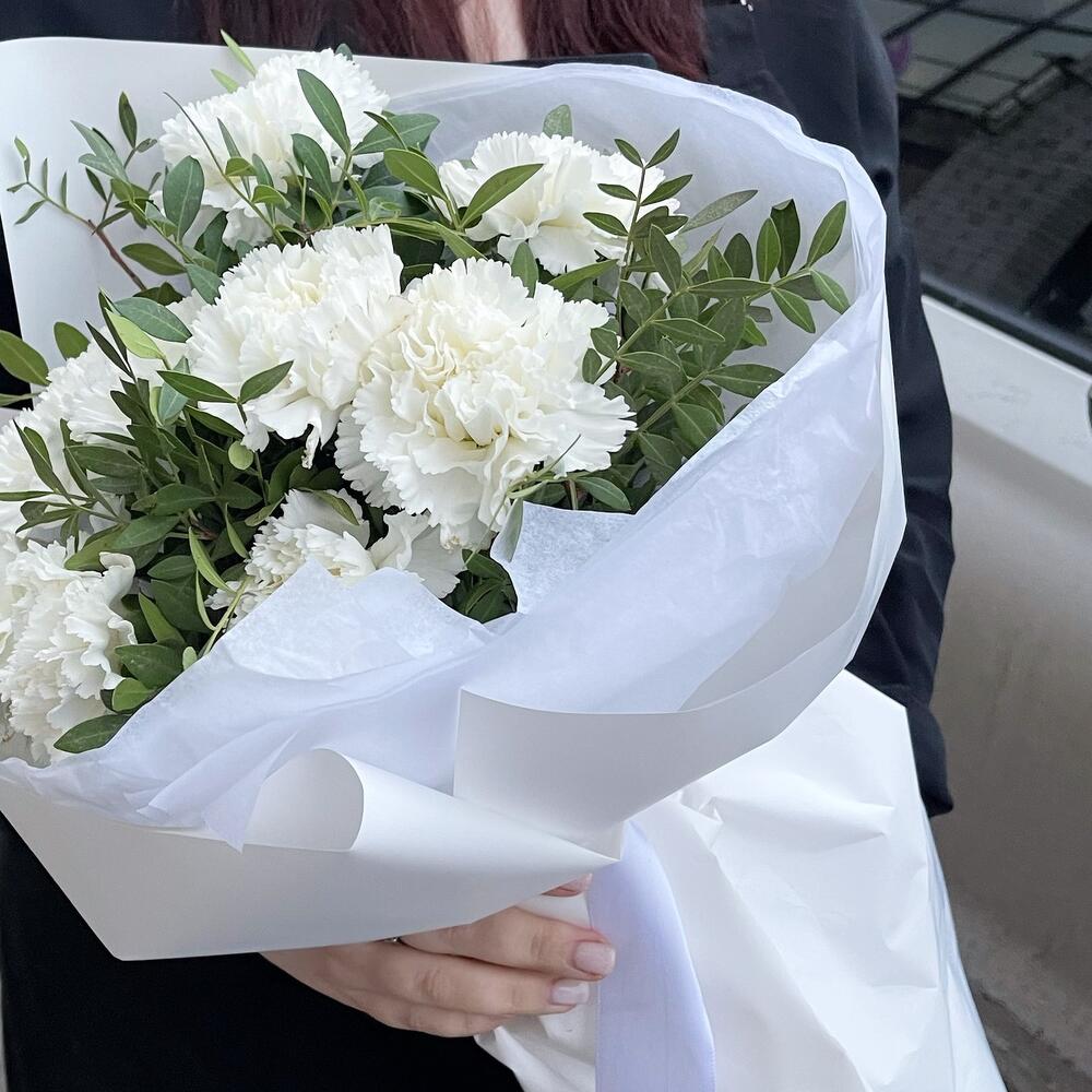 Лента атласная – 1 шт.Диантус – 9 шт.Пленка матовая – 4 шт.Фисташка пучок – 1 шт.Тишью белое – 4 шт.