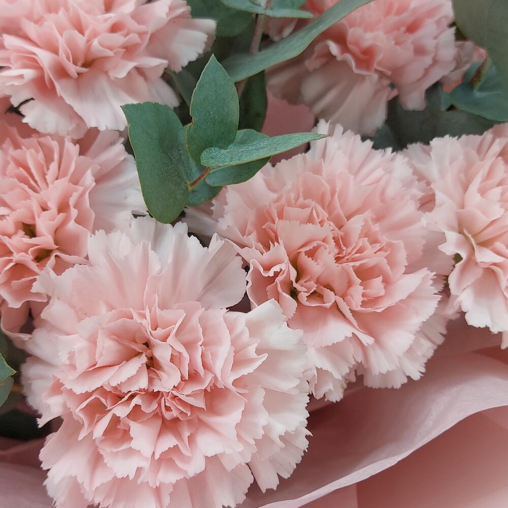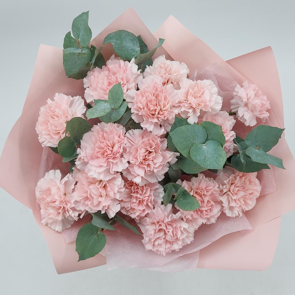 гвоздика сортовая (диантус) – 15 шт.Эвкалипт – 7 шт.Упаковка дизайнерская – 1 шт.