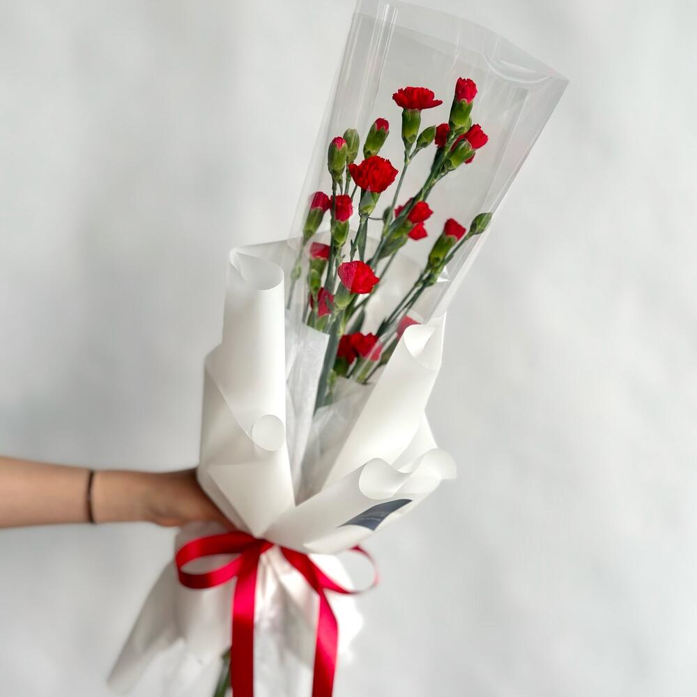 Гвоздика кустовая – 5 шт.Упаковка дизайнерская – 1 шт.Открытка – 1 шт.