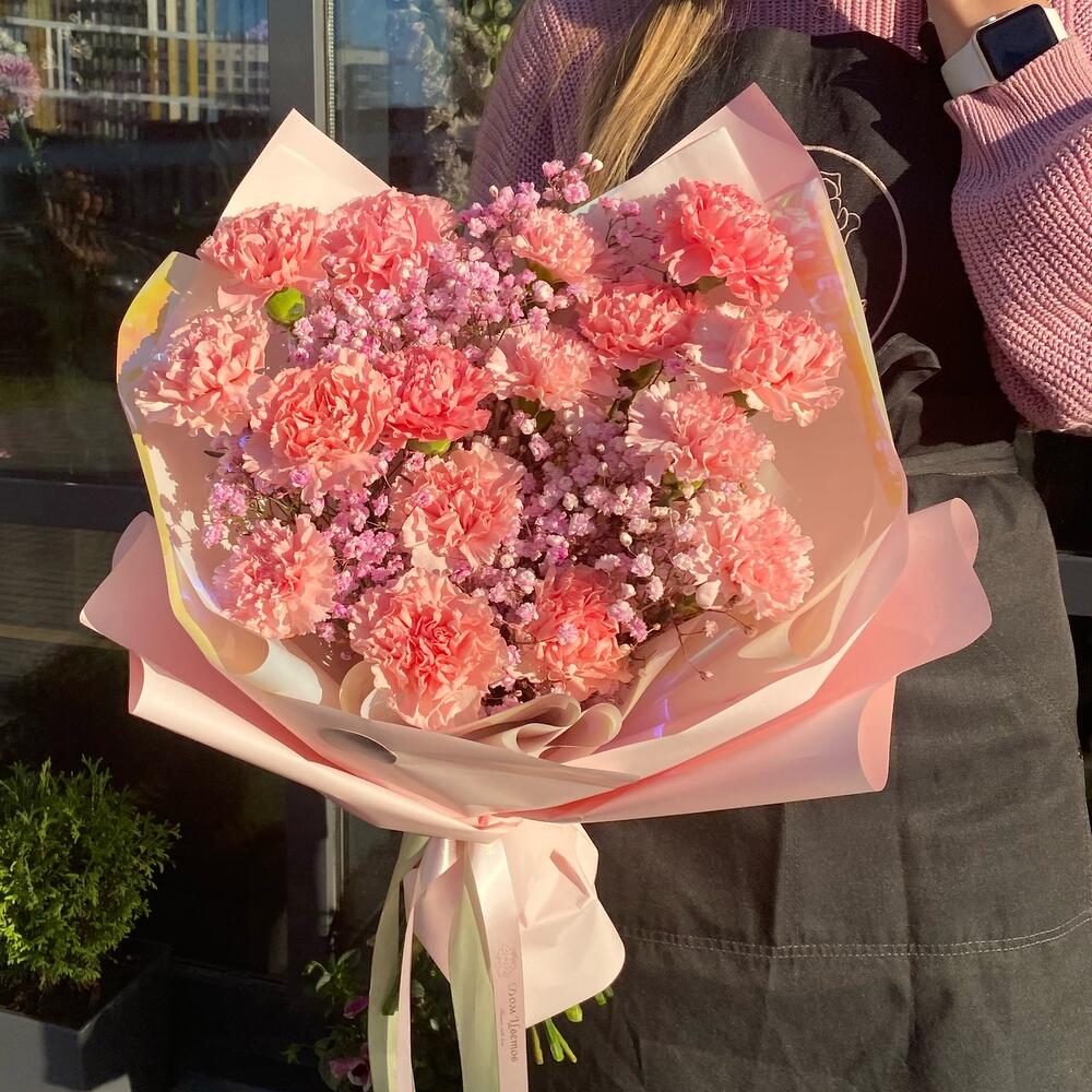 Диантус – 15 шт.Гипсофила – 3 шт.Упаковка дизайнерская – 1 шт.Лента атласная – 1 шт.