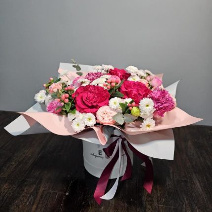 Шляпная коробка – 1 шт. Лизиантус – 4 шт. Хризантема – 1 шт. розы – 3 шт. Диантус – 5 шт. Альстромерия – 2 шт. Эвкалипт – 2 шт.