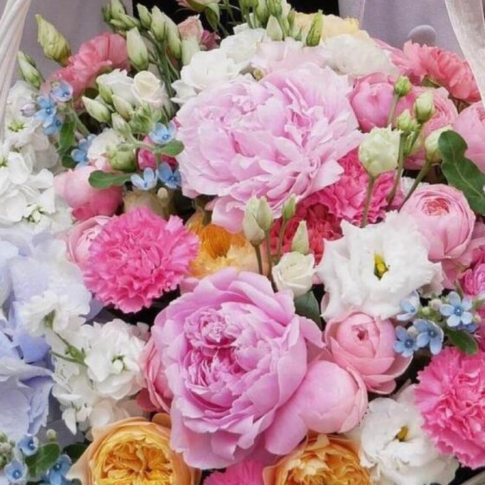Пион – 5 шт.розы пионовидные – 11 шт.Гвоздика – 13 шт.хризантемы – 5 шт.Эустома – 5 шт.Оксипеталум – 5 шт.Маттиола – 5 шт.Корзина плетеная – 1 шт.Открыточка с вашими пожеланиями – 1 шт.Лента атласная – 2 шт.инструкция по уходу за цветами – 1 шт.хорошее настроение – 100 шт.Оазис флористический – 1 шт.Кризал – 1 шт.