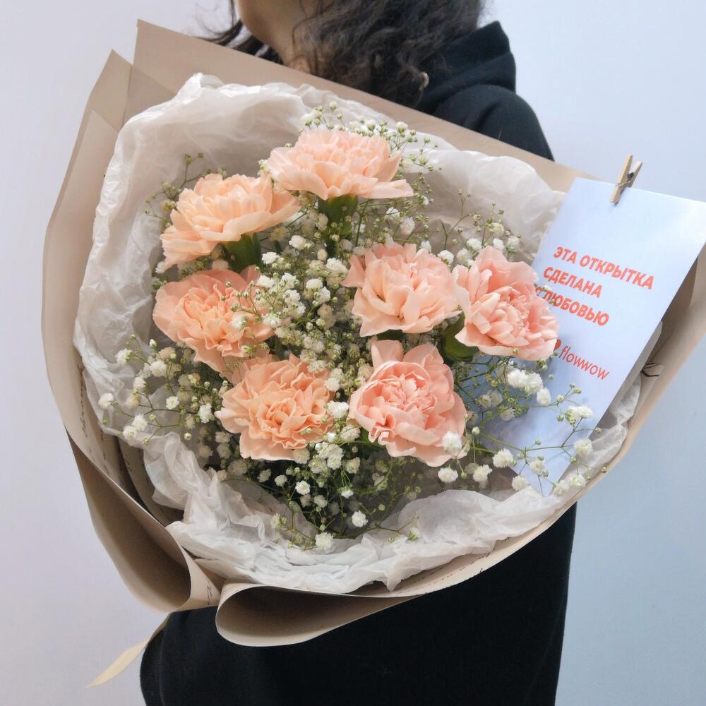 Диантус – 7 шт.гипсофила радужная – 2 шт.Упаковка – 1 шт.Лента атласная – 1 шт.