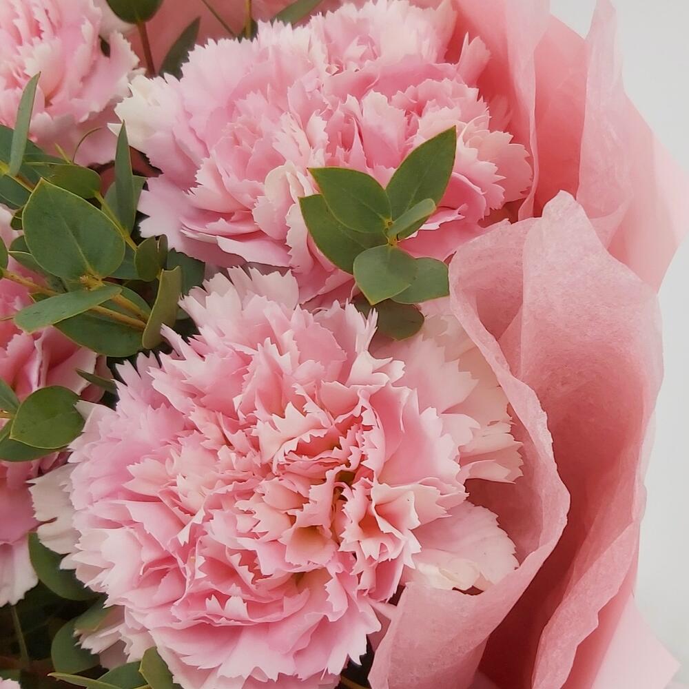 Нежный и стойкий букет из сортовых розовых динтусов и эвкалипта в стильной упаковке в тон. Такой букет всегда уместен и подойдёт для любого повода: День Рождения, именины, годовщина свадьбы, рождение ребенка, 8 марта, День Святого Валентина, выпускной и т.д. Можно вручить маме, сестре, подруге, коллеге, учителю, любимой.