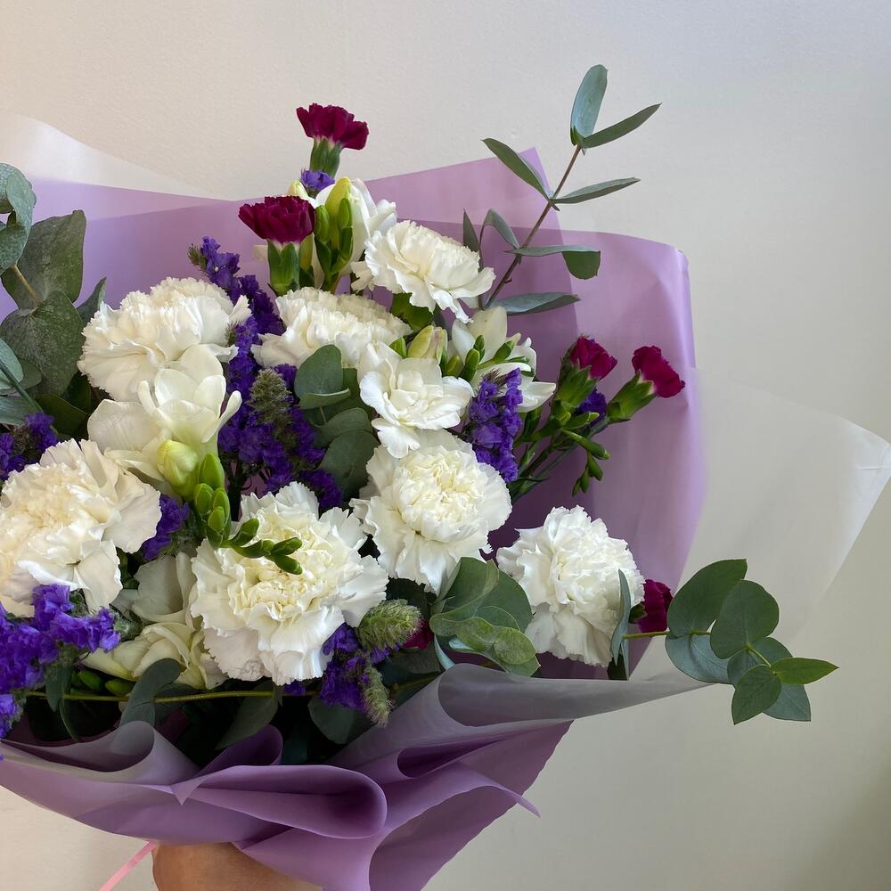 Гвоздика белая – 7 шт.Гвоздика кустовая – 5 шт.фрезия ароматная белая голландия – 6 шт.Зелень – 5 шт.Статица синяя – 4 шт.Упаковка с атласной лентой – 5 шт.