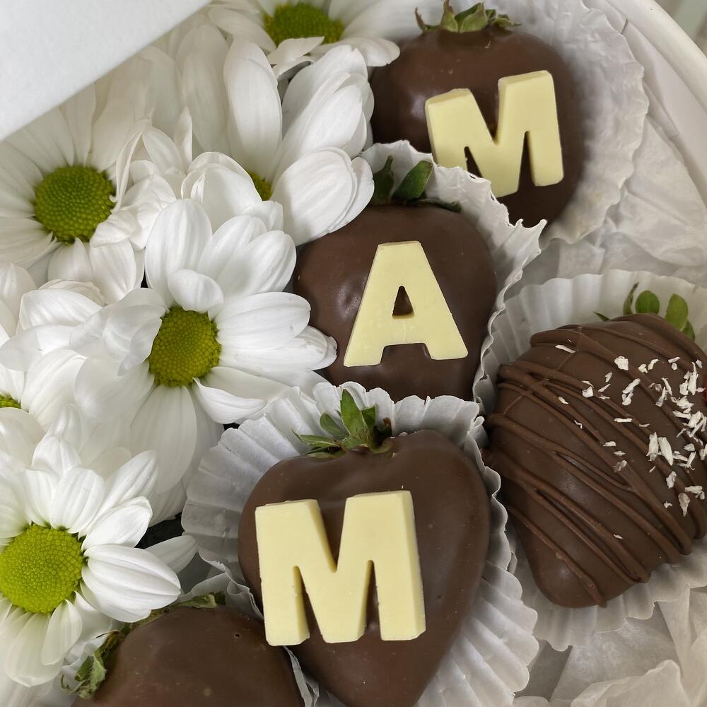Подарочный набор "Маме" хризантема и клубника в молочном шоколаде