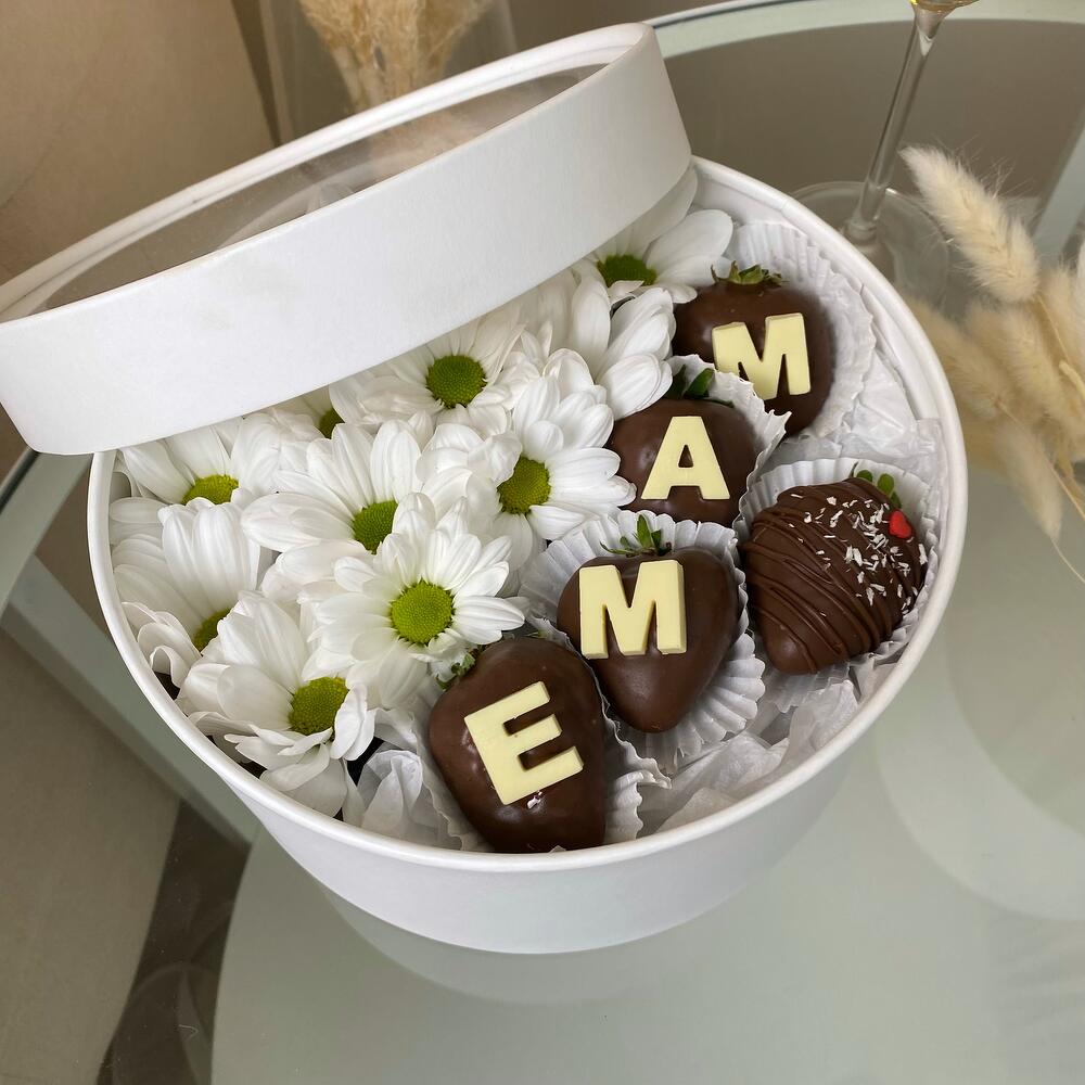 Милейший подарочный набор в круглой коробке с прозрачной крышкой, хризантема и клубника в молочном шоколаде с надписью “Маме”, идеальный подарок для мамы!Срок хранения 24 часа при температуре от +2 до +8