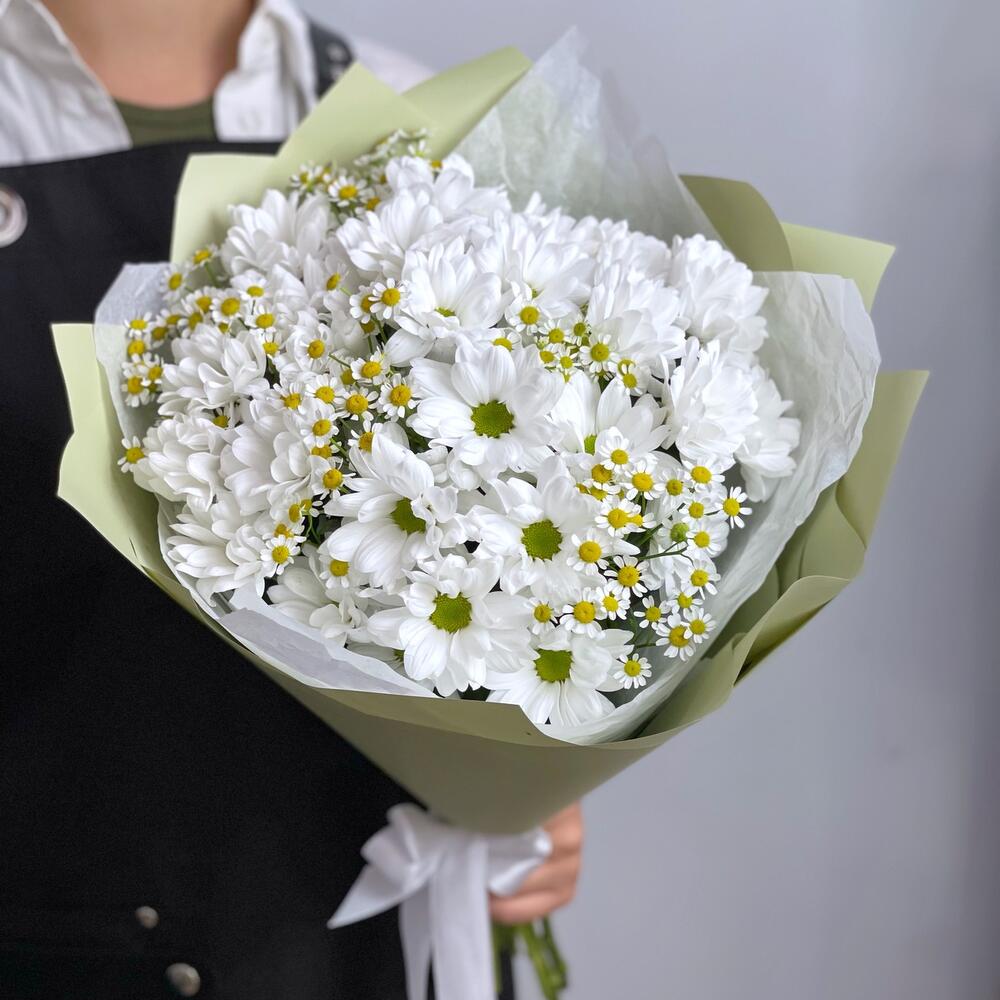 белая хризантема кустовая – 5 шт.Ромашка – 5 шт.Упаковка дизайнерская – 1 шт.