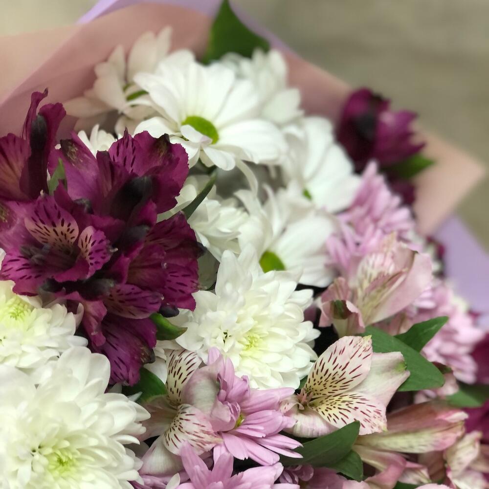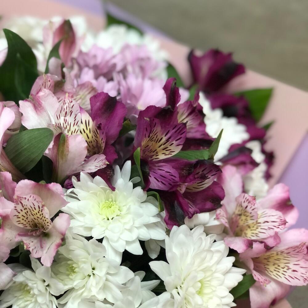 Приятный букет из хризантем и альстромерии.