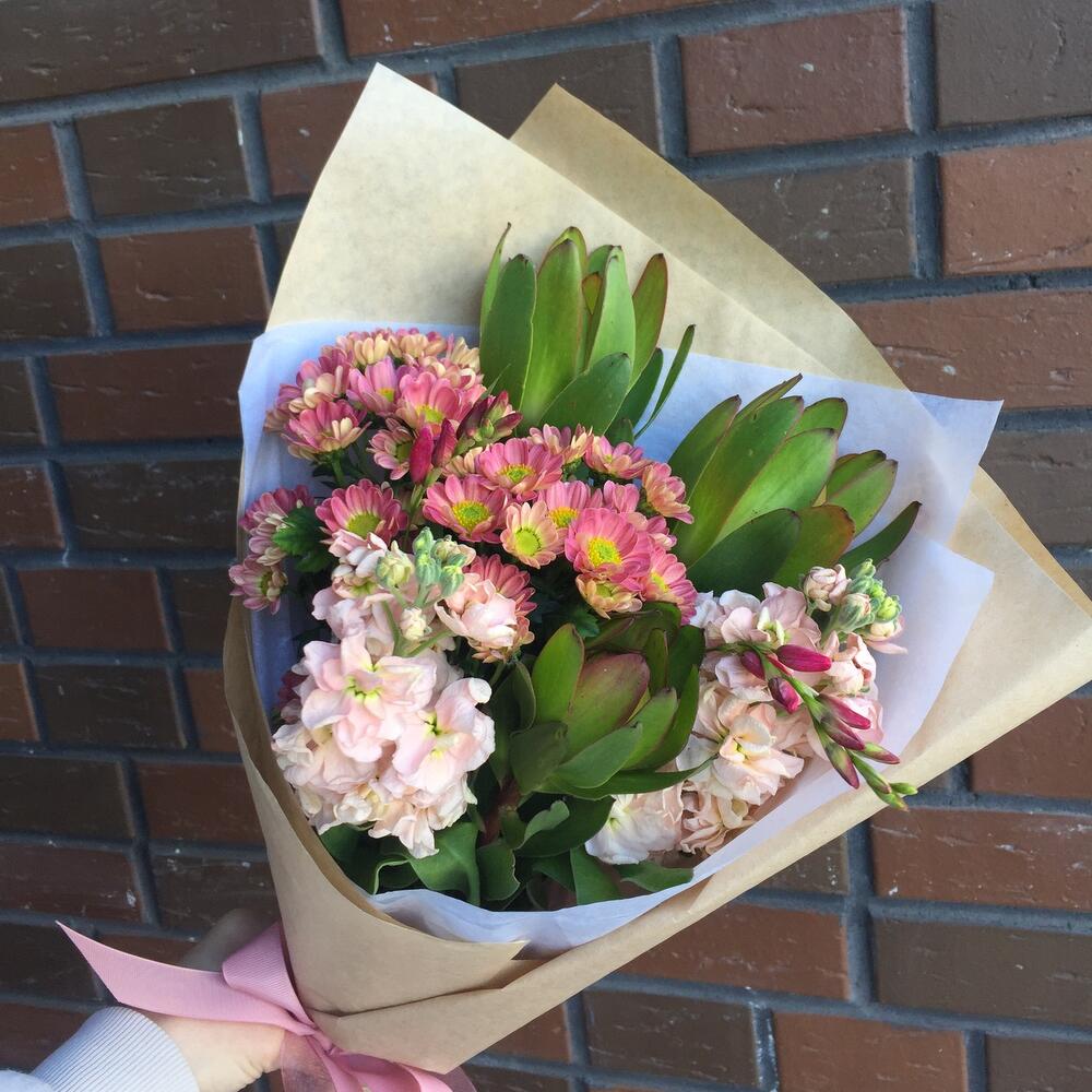 леукондендрон – 3 шт.Маттиола – 2 шт.Хризантема Сантини – 2 шт.иксия – 2 шт.