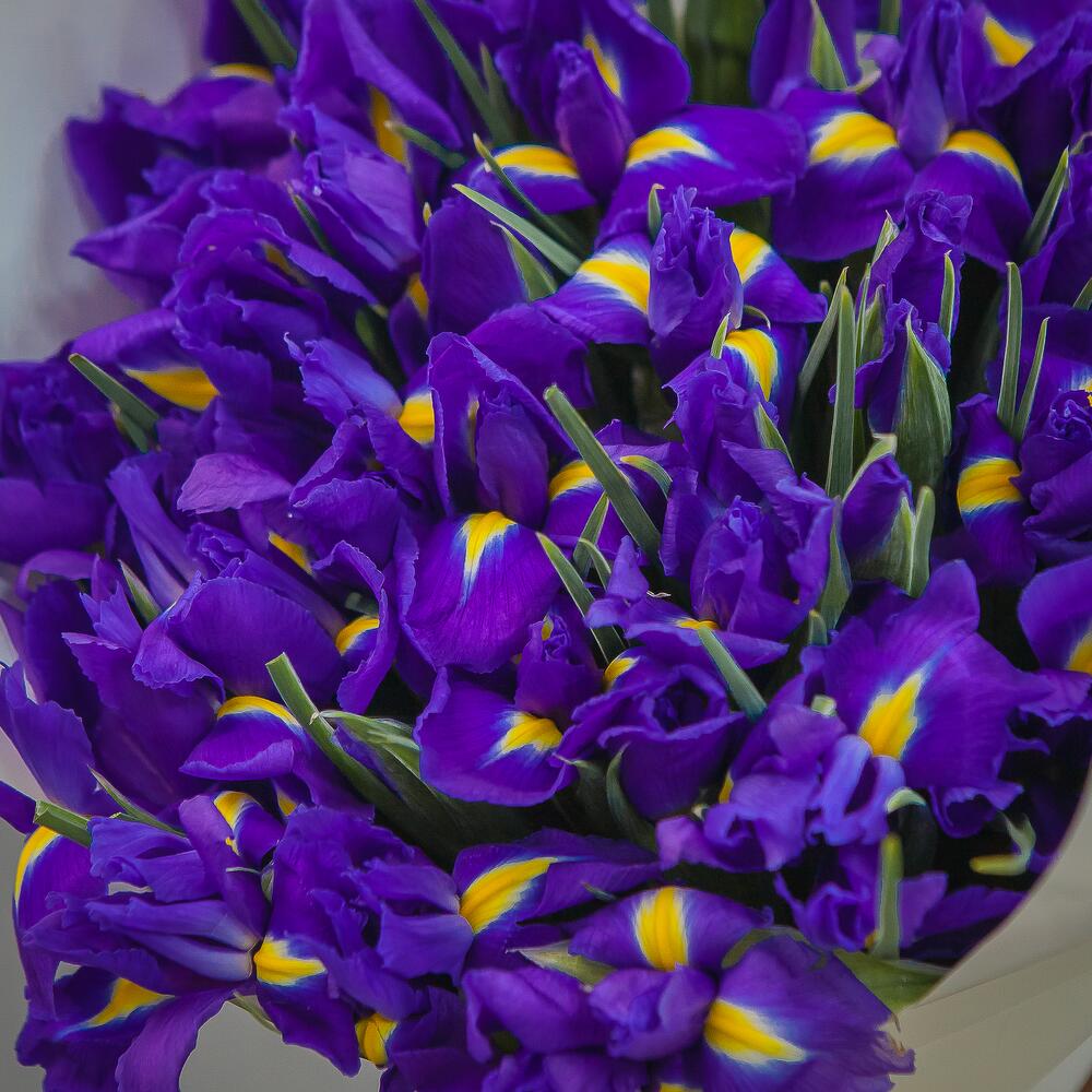 ирисы синие – 51 шт.Упаковка матовая – 1 шт.Лента атласная – 1 шт.