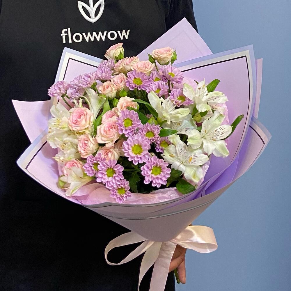 Кустовая роза – 2 шт.Сантини – 3 шт.Альстромерия – 2 шт.Упаковка дизайнерская – 2 шт.Лента атласная – 1 шт.