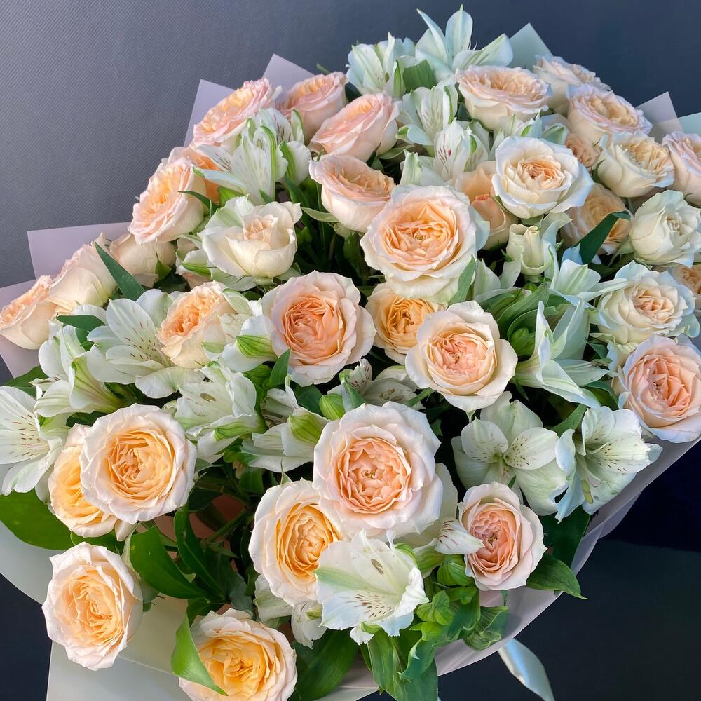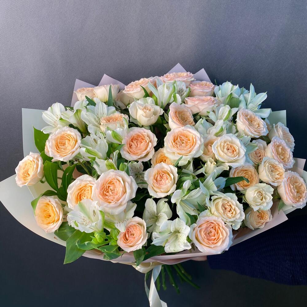 Лента атласная – 1 шт.Упаковка дизайнерская – 4 шт.Альстромерия Микс Европа – 7 шт.роза кустовая розанелла – 6 шт.