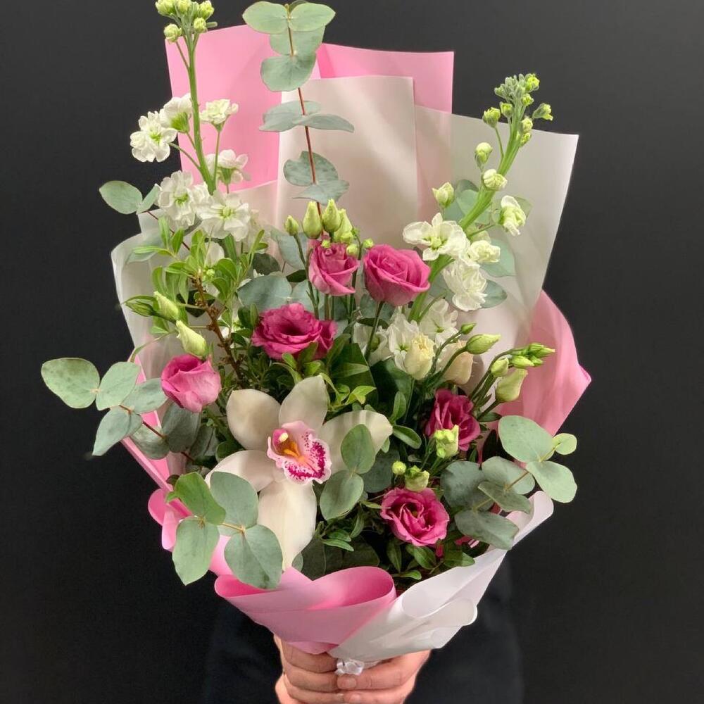 Орхидея Цимбидиум – 1 шт.Маттиола – 2 шт.Лизиантус – 2 шт.Фисташка – 3 шт.Эвкалипт – 2 шт.Упаковка дизайнерская – 1 шт.