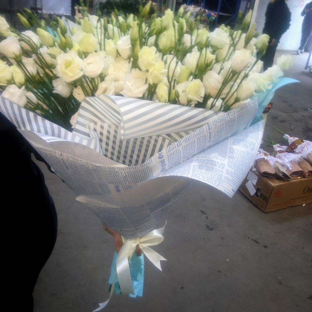 Эустома – 19 шт.Упаковка крафт дизайнерский – 3 шт.Упаковка дизайнерская – 3 шт.Упаковка пленка матовая – 3 шт.Лента атласная – 2 шт.