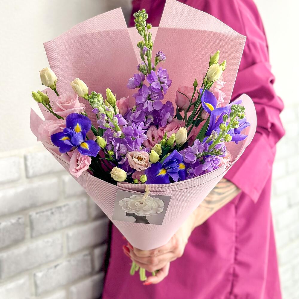 Лизиантус – 4 шт.Маттиола лавандовая – 3 шт.Открыточка с вашими пожеланиями – 1 шт.Средство для продления жизни цветов – 1 шт.инструкция по уходу за цветами – 1 шт.ирисы синие – 3 шт.упаковка зефирка – 3 шт.